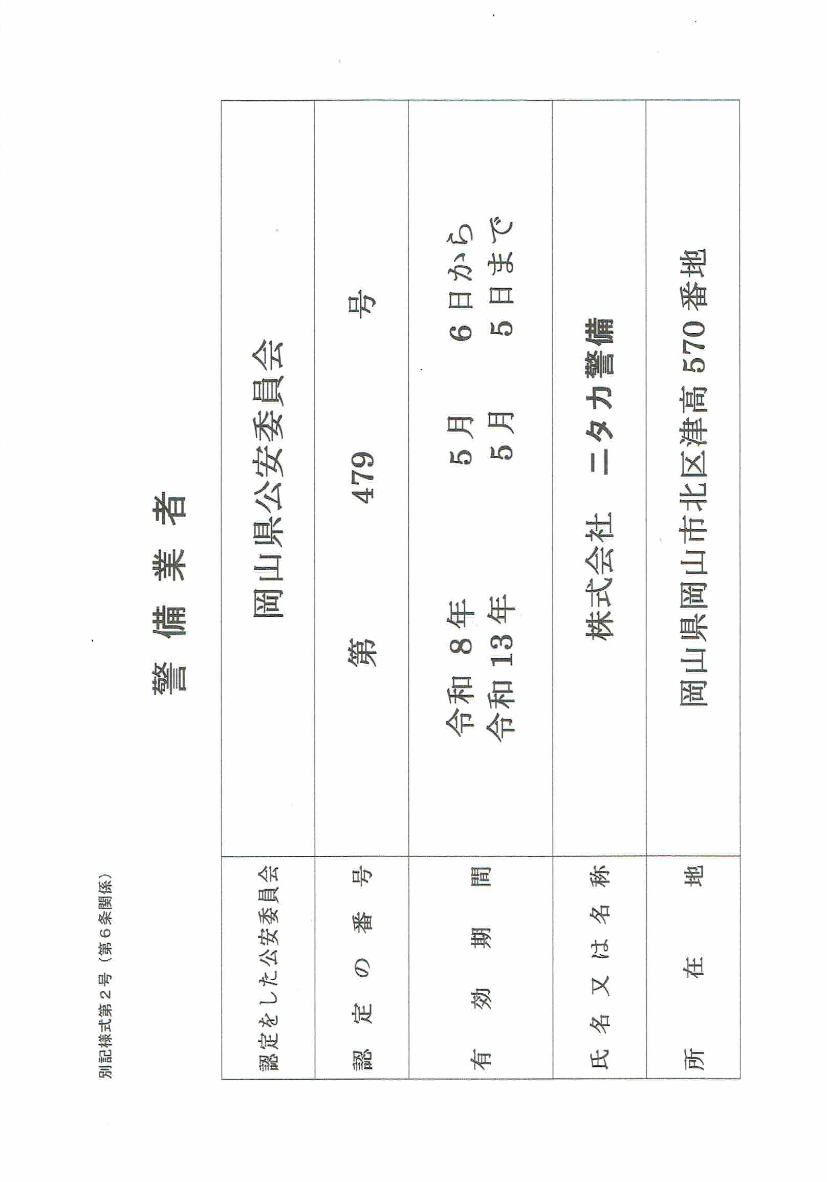 | 業務許可番号 | 岡山県公安委員会認定 第479号 |